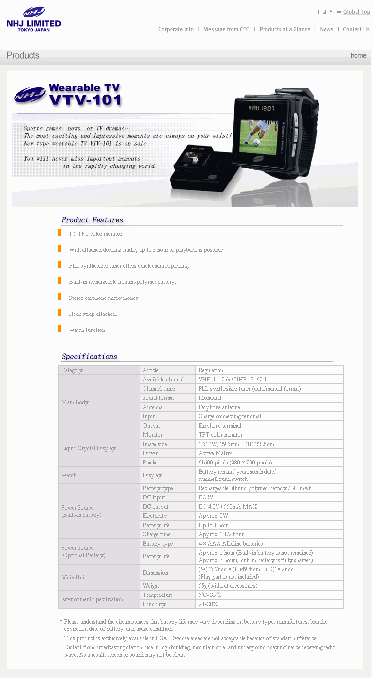 expected the LCD module to last only about seven years ... Technical details are quickly listed: 1.2" display w/o background lighting ("blue/white", 31,920 pixels, 10 shades of grey, 16.8 * 25.2mm), 5 hours running time on one set of batteries, external tuner for VHF & UHF (channels 2 to 83!) and FM stereo radio reception. The watch in its original function can be "misused" as a stop watch (resolution 1/100 seconds) and as alarm-clock. The flexible 6-conductor cable supplies three different voltages (4, 9 and 13 Volt) and separate signals for video and synchronization. The only optional accessory was the AC adapter TD02. If you're curious about the other features of the TV-Watch, here's a link to the user's manual (PDF, 2.4 MB - with thanks to Olivier Bideau from Le Mans, France). Extensive technical data can be found on Jochen Huebl's TV-Watch website (in German), you can also see the watch "in action" (AVI/DivX, 2 MB). Connoisseurs of the Japanese language and fans of cute photos will also enjoy the colorful brochure pages, which can be found behind the following links: page1, page2, page3 (about 250 kB each). I only ever found one brochure in English, which advertises the watch under the brand name EPSON (SEIKO and EPSON are a single company since 1985). In July 1983, the magazine Video Review published a field report about the TV-Watch. And in Germany, the electronics magazine ELO (which has ceased to exist a long time ago) reported in October 1982 about this unique high-tech toy. Like in Octopussy, this article showed the prototype of the TV-Watch. The writing "SUWA SEIKOSHA" was replaced by "SEIKO" for mass production and the cable connector was metal covered in the original version. The retail package included, in addition to all sorts of litterature, and a leather pouch for the tuner and three spare elements for the wristband. The valuable (because no longer available) connecting cable is about 80 cm in length. The watch measures 40 * 49 * 10 mm and with stainless steel wristband and a coin-sized battery (type SR920W) it weighs slightly more than 80 grams, the receiver weighs almost 190 grams with 2 alkaline AAA batteries. The TV-Watch was made in the Fujimi and Matsumoto factories, Japan, from 1982 to 1983. |