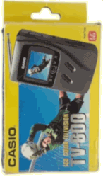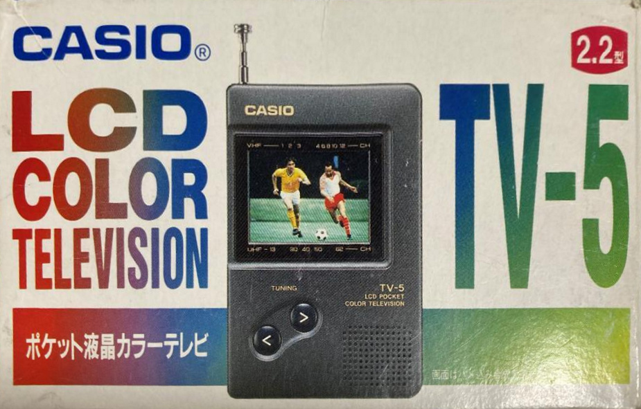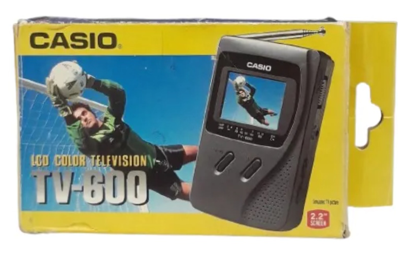 Etwa so groß wie zwei Zigarettenschachteln hintereinander ist der CASIO TV-500. Das kompakte Gerät aus dem Jahr 1988 wirkt richtig putzig, beult aber die Hosentasche ein wenig aus. Als bemerkenswertes Extra besitzt der kleine CASIO immerhin einen A/V-Eingang (3,5 mm). Der Antenneneingang ist leider nur bei den Versionen des TV-500 bestückt, die nicht für den deutschen oder italienischen Markt bestimmt sind. Das (vorsichtig ausgedrückt) wenig berauschende Farbdisplay hat eine Diagonale von 49 mm.