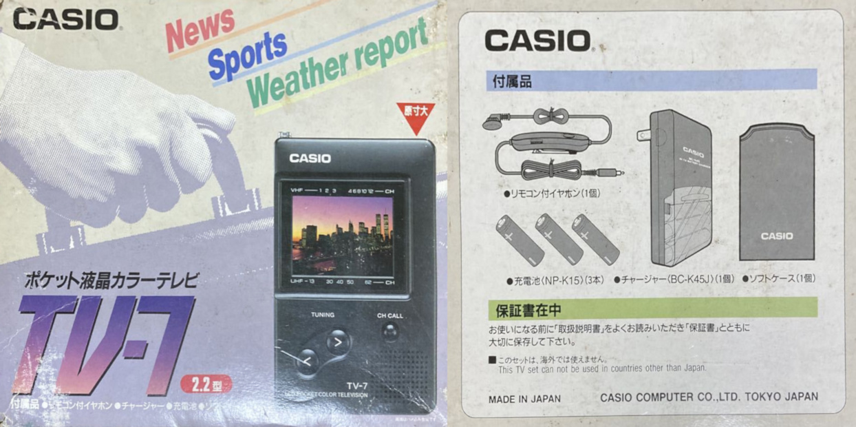 Die Displaydiagonale beträgt 2,2 Zoll gleich 55 mm. Ein Antenneneingang ist zwar vorhanden, in Deutschland aber durch einen entfernbaren Plastikstöpsel verschlossen. Im August 1993 veröffentlichte die Tageszeitung The Times einen Kurztest des TV-7 inklusive des damaliges Verkaufspreises. In Japan war der TV-7 offenbar mit einer kleinen Kabelfernbedienung (WR-7E) zum Preis von 28.800 Yen erhältlich (umgerechnet etwa 375 DM) - beide Informationen kann man dieser bunten Werbung entnehmen. Ein Blick auf die japanische Verkaufsverpackung zeigt, dass darüber hinaus drei Mignon-Akkus vom Typ NP-K15 und ein passendes Ladegerät (BC-K45J) mitgeliefert wurden.