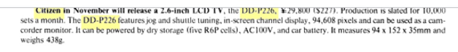 Laut dem Dempa Digest wurde der DD-P226 im November 1988 vorgestellt und kostete in Japan 29.800 Yen bzw. 227$. Die monatliche Produktion sollte zunächst 10.000 Stück betragen. Das Magazin Popular Electronics veröffentlichte in ihrer Januar-Ausgabe 1990 einen ausführlichen Testbericht. Über die Standzeit der Hintergrundbeleuchtung informiert die Bedienungsanleitung wie folgt: Etwa 5 Jahre bei täglich einer Stunde Betrieb. Das klingt ziemlich üppig.