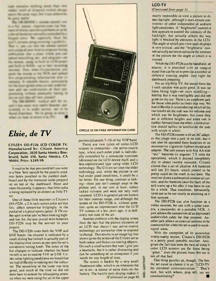 Ansonsten bietet der CITIZEN nicht viel Aufregendes: Passiv-LCD mit 2,6 Zoll (66 mm) Diagonale, Auflösung der PAL-Version 84.240 Elemente (NTSC: 94.608), A/V- und Antenneneingang (jeweils 3,5 mm). Letzterer fehlt - wie üblich - bei Modellen für den deutschen und italienischen Markt. Der abgebildete DD-P226-2B verfügt erfreulicherweise über eine solche Buchse.