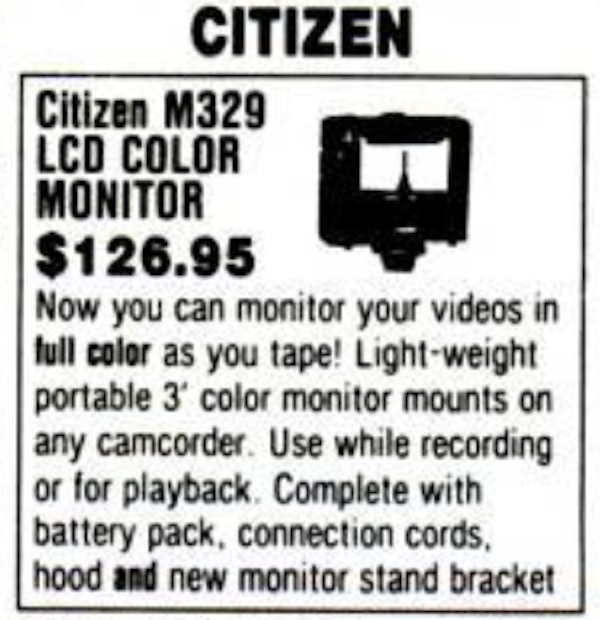 Man teile einen Taschenfernseher sinnvoll in zwei Hälften und heraus kommt... der CITIZEN M329 mit dem externen TV-Tuner CITIZEN TR30. Der Videomonitor M329 (alias TC56) eignet sich prima als Kontrollbildschirm für Videokameras, entsprechendes Befestigungszubehör und diverse A/V-Kabel befinden sich im Lieferumfang. Die Diagonale des passiven LCD liegt bei 2,9 Zoll gleich 76 mm, die Hintergrundbeleuchtung soll mindestens 1.500 bis 2.000 Stunden überleben. Weitere technische Details zum Display beschreibt das besonders ausführliche Datenblatt aus dem Jahr 1989.