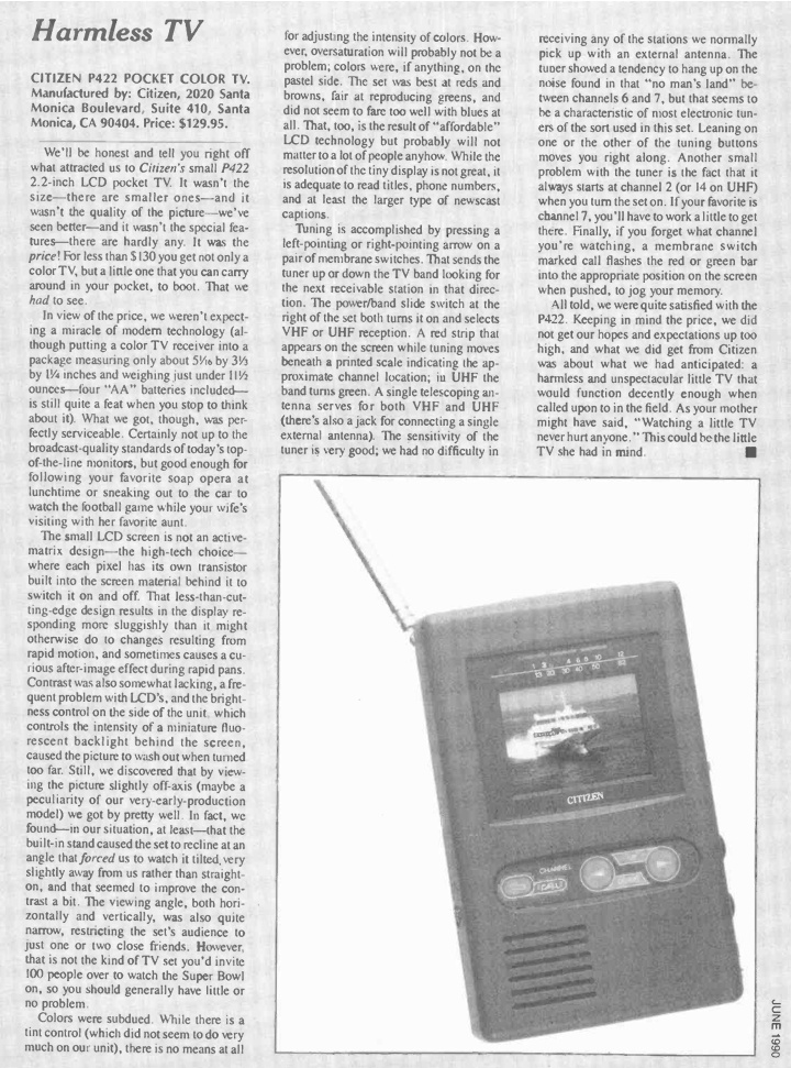 Gegenüber den allgegenwärtigen Geräten von CASIO konnte sich der CITIZEN P422 in Deutschland nur recht schwer behaupten. Der P422 war allerdings auch kaum dazu geeignet, an dieser Situation nachhaltig etwas zu ändern. Das passive Display hat eine Diagonale von knapp 54 mm, die Bildqualität liegt allenfalls auf CASIO Einstiegsniveau. In Sachen Antennenanschluss ist man sich ebenfalls einig: Die Modelle für den deutschen Markt (P422-ID) besitzen offenbar keinen Anschluss, Exemplare ohne deutsche Zulassung (z.B. der oben in der Mitte abgebildete P422-1H) verfügen an der Oberseite über eine entsprechende Buchse.