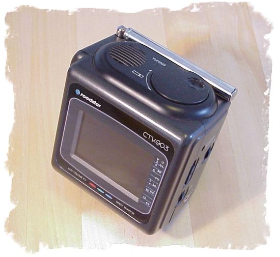 Der Roadstar CTV-903 (alias CITIZEN DD-T126) ist ein kleines Highlight unter den "Passiven". Das würfelförmige Gehäuse wird durch einen mehrfach verstellbaren Halter in Position gebracht. Statt des üblichen Sendersuchlaufes kommt hier ein Drehknopf an der Gehäuseoberseite zum Einsatz, mit dem das gewünschte Programm ruck-zuck eingestellt werden kann. Weitere Ausstattungsmerkmale: Bilddiagonale 65 mm, Stativgewinde, Farbkontrastregler und ein A/V-Eingang (3,5 mm). Grundsätzlich verfügt das Gerät auch über eine Antennenbuchse - nicht jedoch die Ausführung für den deutschen Markt. Die Leistungsaufnahme liegt bei heftigen 4,1 Watt.