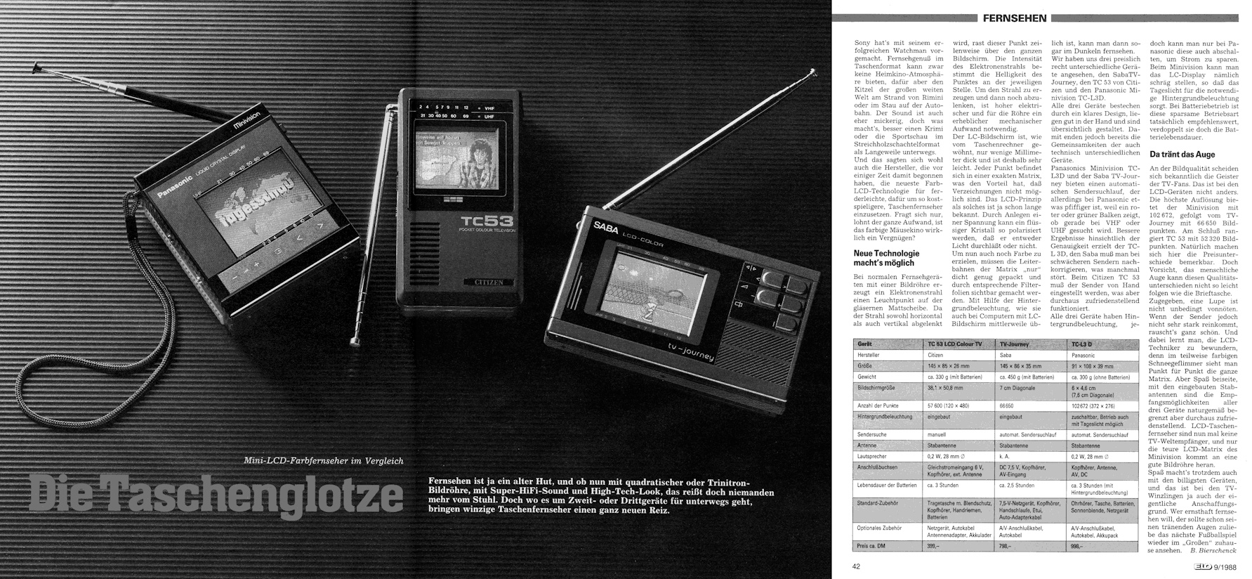Die rustikale Senderwahl mit Skalenzeiger macht's deutlich: Der Roadstar CTV-902 und der CITIZEN TC53 stammen eher aus den früheren Jahren der Farb-Taschenfernseher. Alle weiteren Eigenschaften entsprechen der analogen Standardklasse: Konventionelles "Hochkant-Design", seitlich angebrachte Teleskopantenne, Netzteil- und Kopfhöreranschluss, Helligkeits- und Farbkontrastregler. Das passive LCD hat eine Diagonale von 63 mm und besteht aus 120 * 480 = 57.600 (PAL) bzw. 109 * 480 = 52.320 (NTSC) Elementen. Einen A/V-Eingang sucht man vergeblich, einen Antennenanschluss findet man bei der abgebildeten Version „1H“ des CITIZEN (die nicht für Deutschland oder Italien bestimmt war) hingegen schon. Im Gegensatz dazu hat der Roadstar keinen nutzbaren Antennenanschluss.
