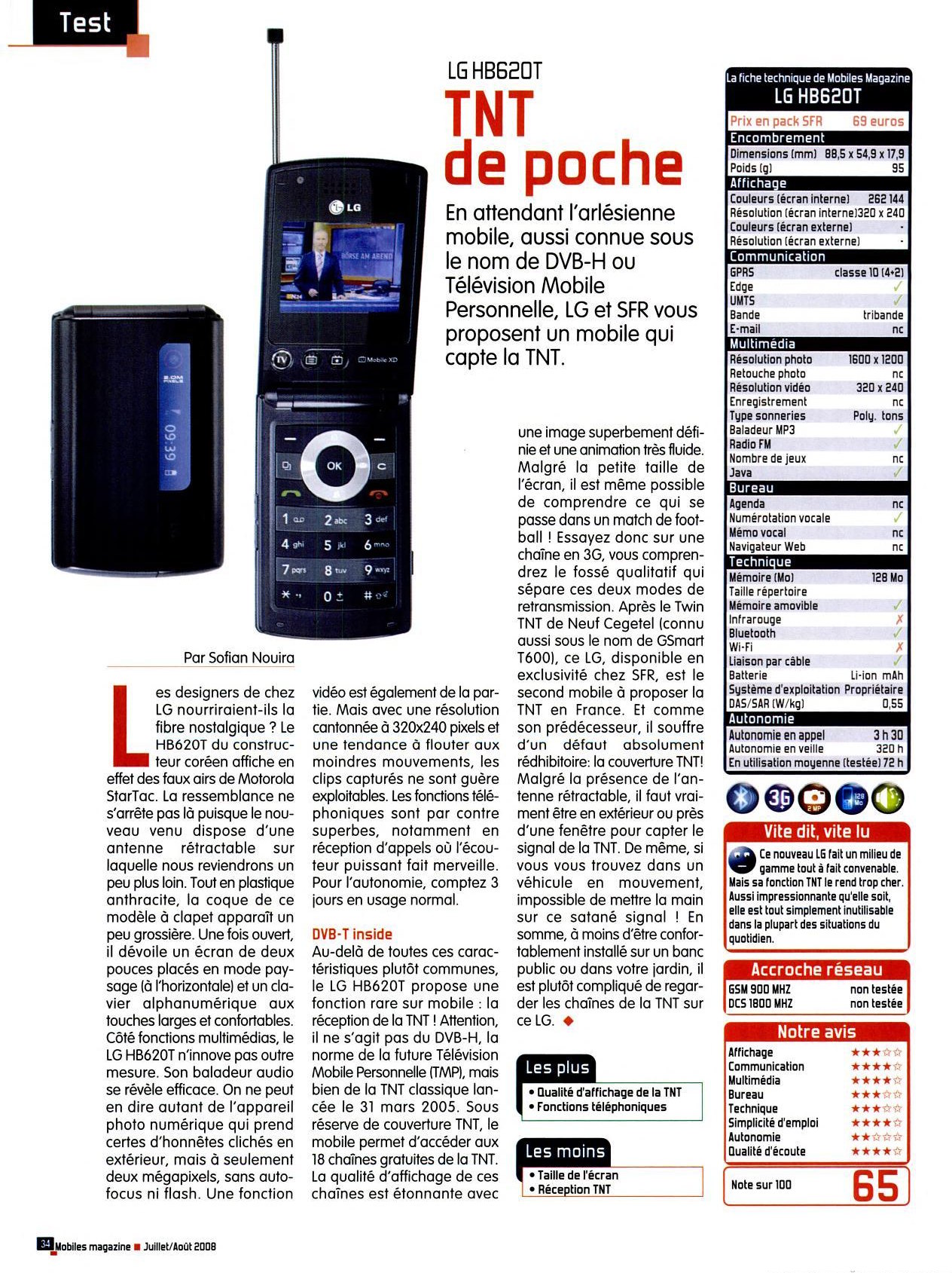 Pünktlich zur Fußball Europameisterschaft 2008 hat der koreanische Konzern LG das erste DVB-T Handy auf den deutschen Markt gebracht: Das LG HB620T ist seit Mai 2008 in Deutschland zum Listenpreis von 399.- Euro erhältlich und eigentlich eine recht gelungene Konstruktion. Kompakt und irgendwie "knuffig", aufgeklappt prima zum TV gucken und mit ganz brauchbaren Lautsprechen ausgestattet. Natürlich ist das TFT-Display winzig (2 Zoll bzw. 31 * 41 mm), aber mit einer Auflösung von 240 * 320 Elementen reicht es für eine knackscharfe Darstellung. Der DVB-T Empfänger unterstützt nur das UHF-Band, das war aber nur in den Anfangsjahren des Systems ein Problem. Einen elektronischen Programmführer (EPG) kennt das HB620T leider noch nicht. Einzigartig ist die Teleskopantenne konstruiert: Unten am Gelenk startet nicht (wie üblich) der "dicke" Teil der Antenne, sondern das dünnste Element.