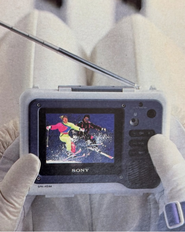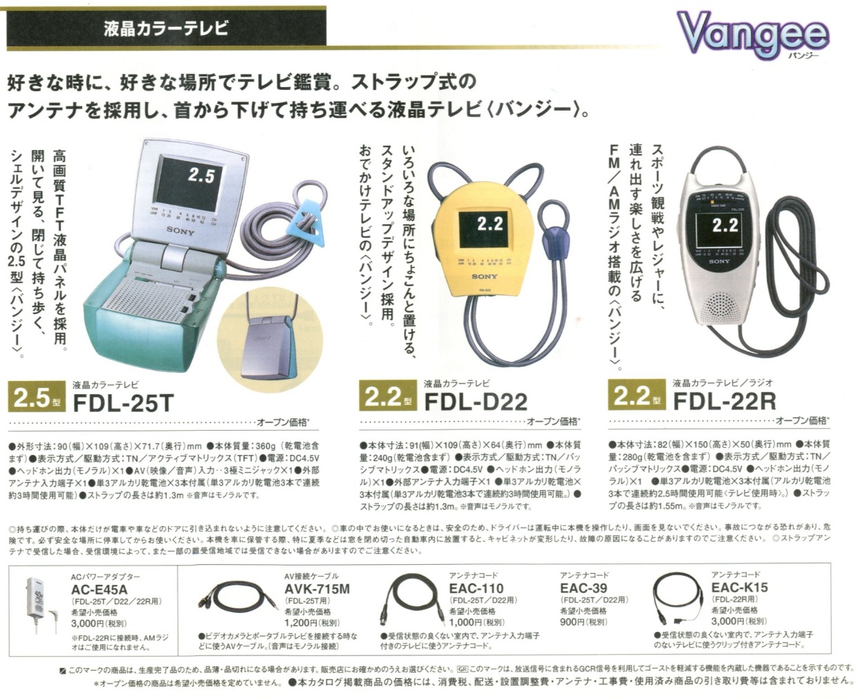 Langweilig, rechteckig, schwarz. Im Jahr 2000 hat sich der "Erfinder" des Watchman dieses Problems angenommen und einen pfiffigen Design-Hit kreiert: Den SONY FDL-250T. Die einzigartige Klappkonstruktion schützt das hochwertige TFT-Display (63 mm, 112.320 Pixel) beim Transport und dient im Betrieb als ganz brauchbarer Sonnenschutz. Die weiteren Extras: Straptenna™ (eine in die 130 cm lange Kordel eingearbeitete Antenne), A/V- und Antenneneingang (jeweils 3,5 mm). In Japan war das Gerät als FDL-25T erhältlich - was der Schriftzug "Vangee" bedeutet, ist mir allerdings noch ein Rätsel.