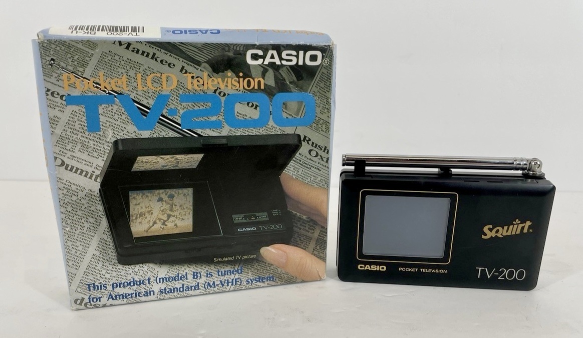 Vielleicht war CASIO TV-200 aus dem Jahr 1986 zu jener Zeit der kleinste aller schwarzweißen Taschenfernseher. Aber selbst wenn, wäre das Interpretationssache: Er ist tatsächlich noch ein wenig kleiner als z.B. der CITIZEN 06TA, allerdings besitzt dieser auch einen eingebauten Lautsprecher, während der TV-200 nur mit einem Ohrhörer oder einem externen Lautsprecher sinnvoll betrieben werden kann. Die genauen Abmessungen des kleinen CASIO betragen 108 * 22 * 63 mm.