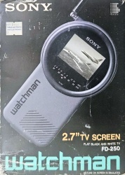 Konventionelle Technik im etwas anderen Design, das ist der SONY FD-250 aus dem Jahr 1990. Die 2,7 Zoll Flachbildröhre (68 mm, Typ 03JM) kommt unter anderem auch im SONY FD-230 zum Einsatz. Und genauso wie dieser, gehört der 250er eher zu den Sparmodellen: Kein "Nur-Ton-Modus" wie bei vielen anderen Watchmännern, kein Antenneneingang, keine besonderen Einstellmöglichkeiten. Allerdings ist ein A/V-Eingang vorhanden (3,5 mm), ein bei Röhren-Taschenfernsehern eher seltenes Feature.