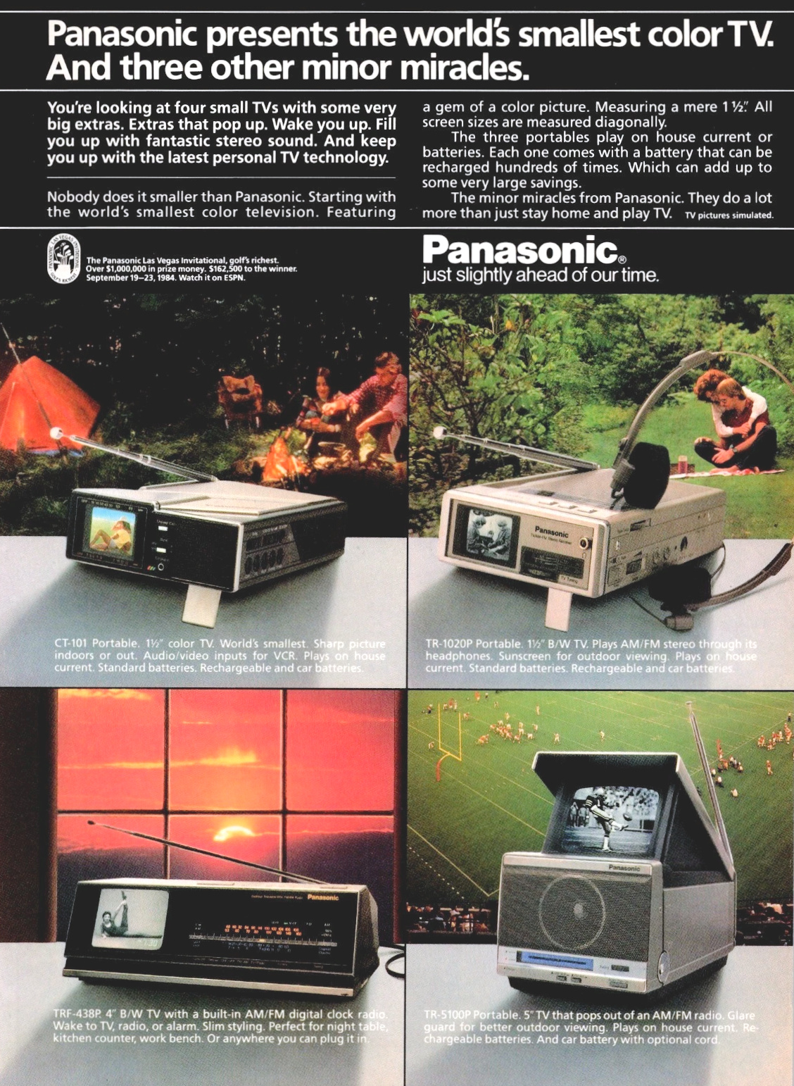 Kein Gerät für die Jackentasche, aber fraglos ein Stück Technikgeschichte: Der in der Mitte abgebildete Panasonic TC-30 gehörte Anfang der 80er Jahre zu den kleinsten Farbfernsehern weltweit. Der TC-30 ist die PAL-Version des Ende 1981 vorgestellten "japanischen" National Pana Color TH3-W3V, der es aufgrund seiner für damalige Verhältnisse unglaublichen kleinen Abmessungen sogar ins Guinness Buch der Rekorde schaffte. Ebenfalls für das Farbsystem NTSC konzipiert, war das Gerät in den USA als Panasonic CT-3311 erhältlich.