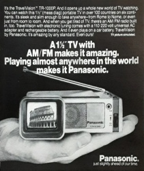 In den 70er und 80er Jahren entstanden in den Werkstätten von National Panasonic eine Reihe bemerkenswerter Fernsehgeräte, darunter die absolut kultige "fliegende Untertasse" TR-005. Kaum minder bemerkenswert waren die putzigen Minifernseher mit einer Bilddiagonalen von jeweils 1,5 Zoll. Dieser Panasonic TR-1020 ("Ultra-Compact") wurde nach meinen Unterlagen zwischen 1982 und 1984 gebaut und in den USA zunächst für 269$ angeboten. In Japan kostete er 1982 regulär 39.800 Yen, das waren umgerechnet etwas mehr als 400 DM.