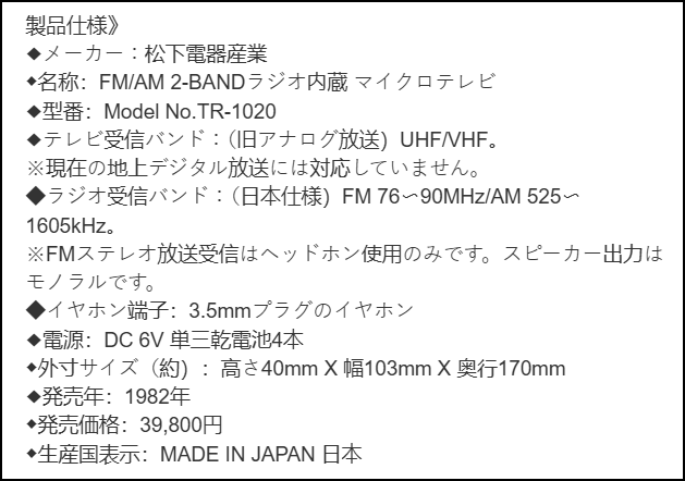 Im Jahr 1972 war ein vergleichbares Modell in Japan unter der Bezeichnung National TR-101B erhältlich. Der Preis lag bei 99.000 Yen, das waren damals umgerechnet etwas über 1.000 DM. Noch seltener als die Geräte selbst ist übrigens das Original-Netzteil mit seinem ganz besonders exotischen Stecker. Im Lieferumfang befand sich zudem eine Vergrößerungslupe, dieses Extra bot Panasonic auch für alle Nachfolgemodelle an.