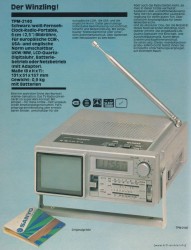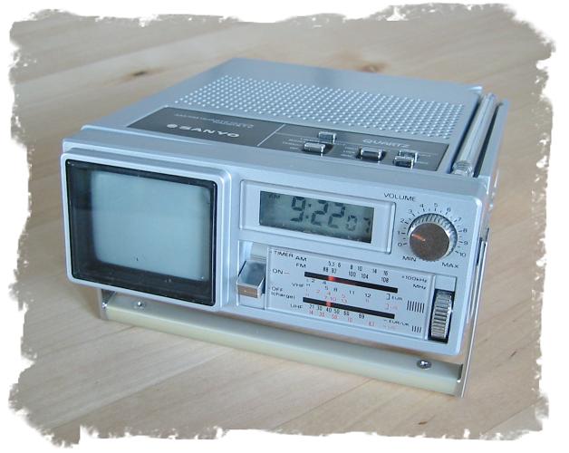 "Zwei Zoll" war Anfang der 80er Jahre bei japanischen Mini-Fernsehern das Maß aller Dinge. Dieser SANYO TPM 2170 (alias Philips / Magnavox BD 3902) macht da keine Ausnahme: Die konventionelle Bildröhre hat eine sichtbare Diagonale von rund 50 mm. Ebenfalls typisch für diese Epoche: Eine beleuchtbare Digitaluhr ziert die Front des vergleichsweise kompakten Geräts. Leider wurden damals die flüssigen Kristalle nur zur Zeitanzeige herangezogen, nicht zur Darstellung des Fernsehbildes. Dafür kann man sich mit Radioklängen, per TV oder von einem Piepser wecken lassen.