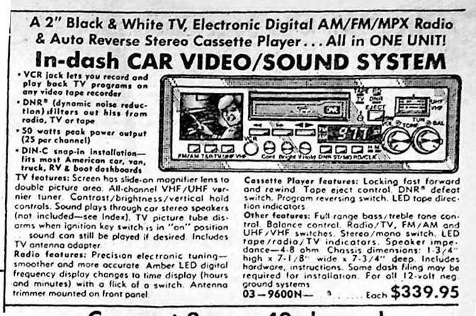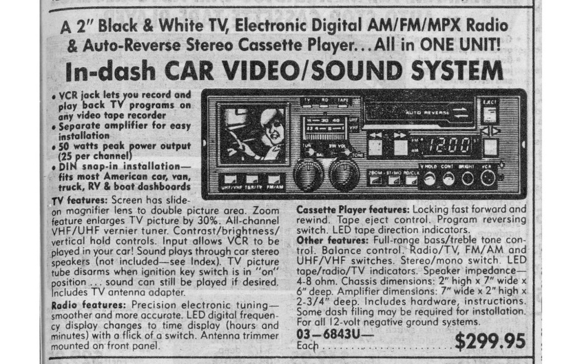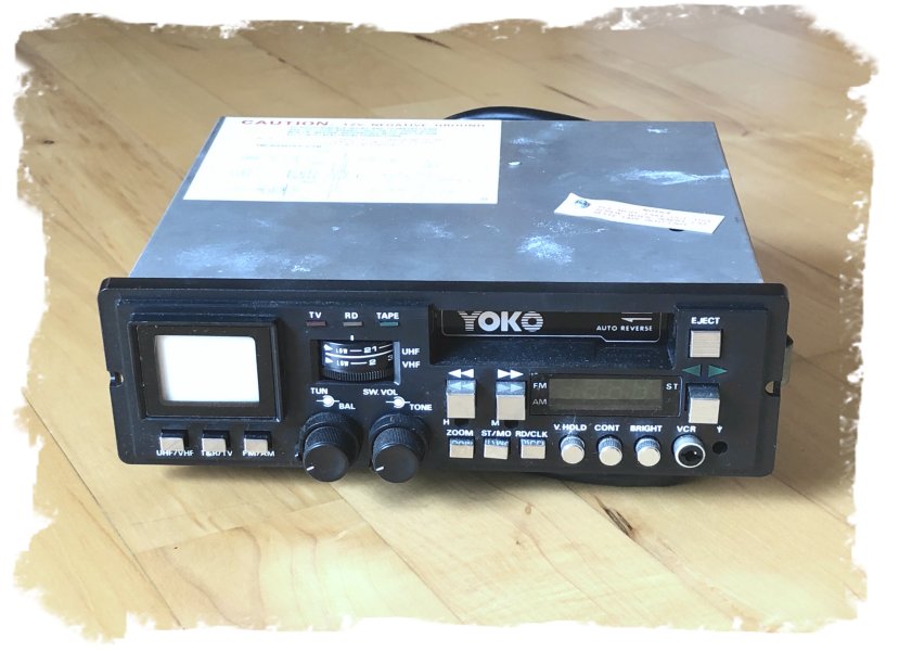 The Holy Grail of pointless-yet-awe-inspiring 1980s car accessories! Während man es Anfang der 2010er Jahre schaffte, aus einem kompakten DIN-Autoradio ein 7 Zoll großes LCD-Display mittels einer trickreichen Mechanik herausfahren zu lassen, konnte man zu Zeiten der Glasbildröhre eigentlich nur vollkommen unbrauchbare Autoradio-TV-Kombis bauen. Wie zum Beispiel diese kuriosen Modelle YOKO CCTV-1 (oben links) und YOKO CTV-2000. Die Schwarzweißbildröhre der Zwillinge hat eine Diagonale von gerade einmal 1,5 Zoll (35 mm) und liefert ein helles aber winziges Bild. Mithilfe einer Aufstecklupe kann es auf etwa 5 cm vergrößert werden. Natürlich verringert sich damit der Einblickwinkel drastisch, sodass Fahrer oder Beifahrer eigentlich gar nichts mehr sehen können :-|