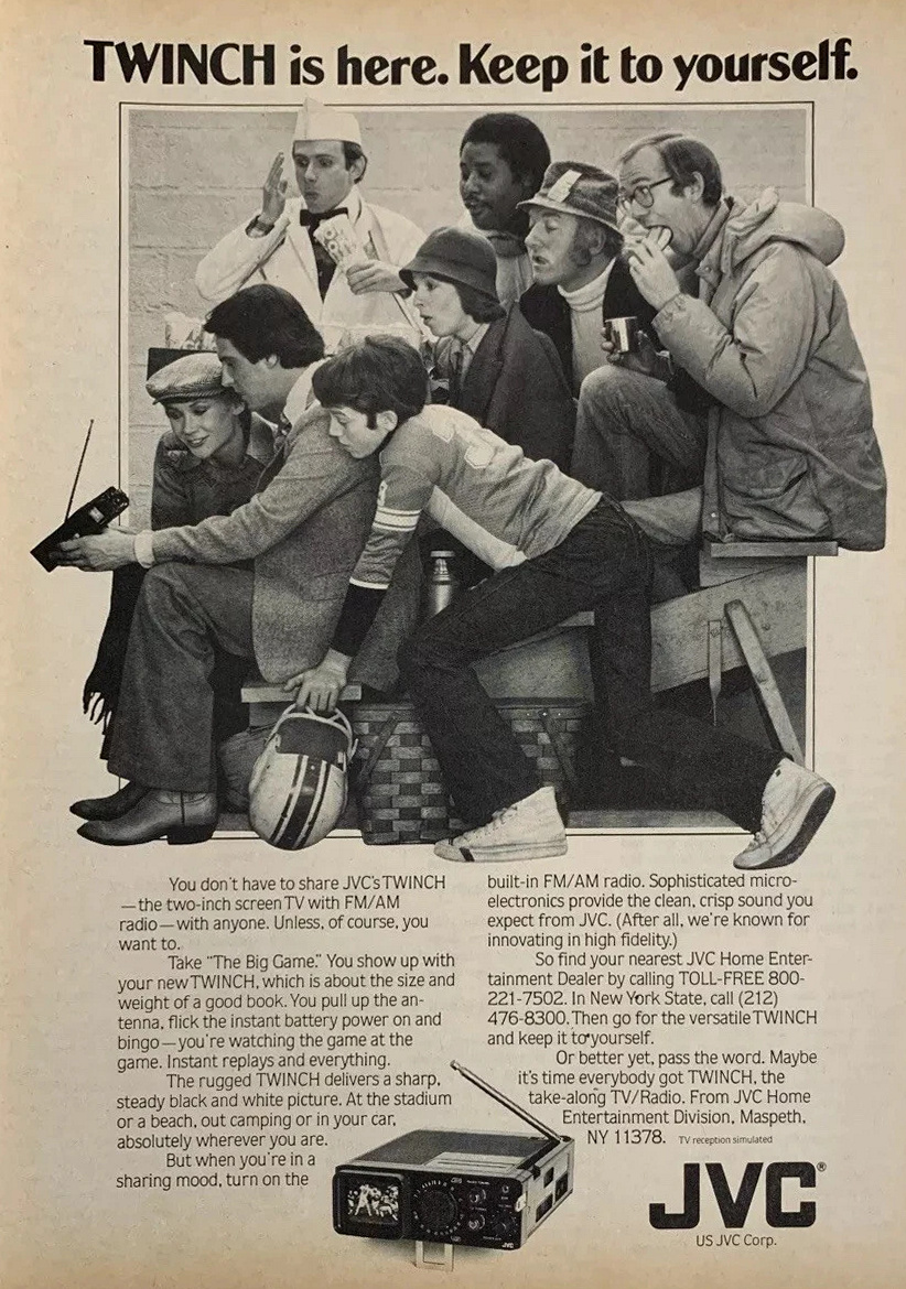 Unter dem schicken braunen Regenmantel verbirgt sich ein Mini-Fernseher der Victor Company Of Japan: Der JVC P-100AE aus dem Jahr 1978. Neben Fernsehprogrammen empfängt der P-100 auch UKW- und Mittelwellensender und nennt sich zu jener Zeit "Der Welt kleinste Fernseh-Radio Kombination".