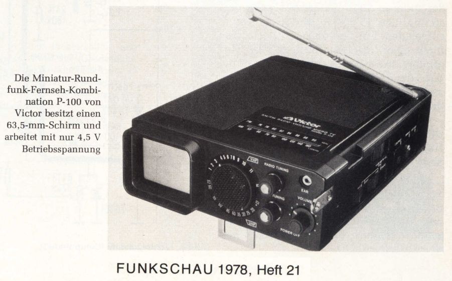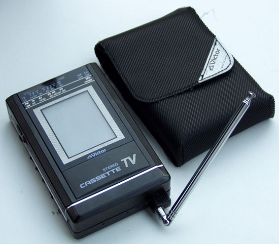 P.S. Der kleinste Fernseher aus dem Hause JVC dürfte der Victor CX-V9 gewesen sein, ein Kombigerät aus Kassettenspieler, Radio und TV - vermutlich aus dem Jahr 1988. Der CX-V9 verfügt über ein schwarzweißes LC-Display und erinnert vom Aufbau an den Sharp JC-AV1, der ebenfalls Ende der 80er Jahre auf den Markt kam.