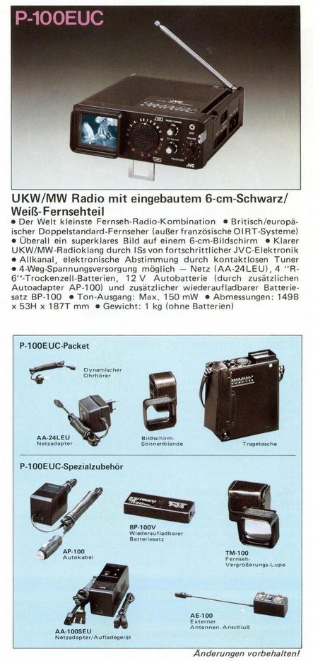 Zur Markteinführung kostete der Victor P-100 (alias "Kiddy") in Japan 52.800 Yen, das waren damals rund 450 DM. Einen Blick auf das komplette Zubehörprogramm offenbart der folgende Klick. Im Oktober 1978 veröffentlichte die Zeitschrift Funkschau erstmals ein Bild des P-100. Der kleine Kasten verbraucht bescheidene 1,7 Watt, die Bilddiagonale beträgt (ohne Vorsatzlupe TM-100) etwa 50 mm. Das Gewicht liegt bei knapp 1.200 Gramm - zuzüglich Akkupack. Made in Japan.
