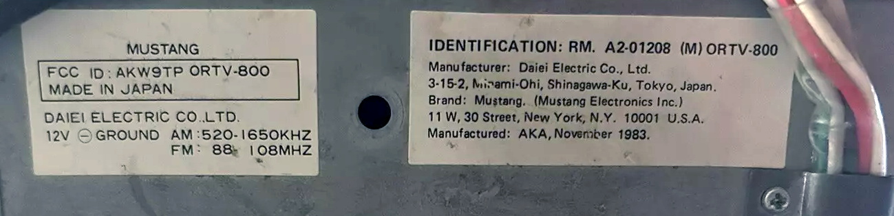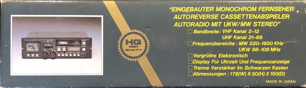 P.S. Das Zitat am Anfang des Textes stammt von einer schönen Auto-Fan-Seite, die u.a. darüber informiert, dass auch ein YOKO unter dem Label „MUSTANG ORTV-800“ vertrieben wurde. Als Hersteller wird die Daiei Electric Co., Ltd. genannt, möglicherweise gibt's die sogar noch. Mitte der 80er ging der ORTV-800 in den USA für 340$ über den Tresen, die Version, die eher wie der CTV-2000 aussieht, beim gleichen Anbieter für nur 300$. Unbenutzte Exemplare werden 40 Jahre später zu wilden Preisen auf eBay angeboten (NOS = New Old Stock).