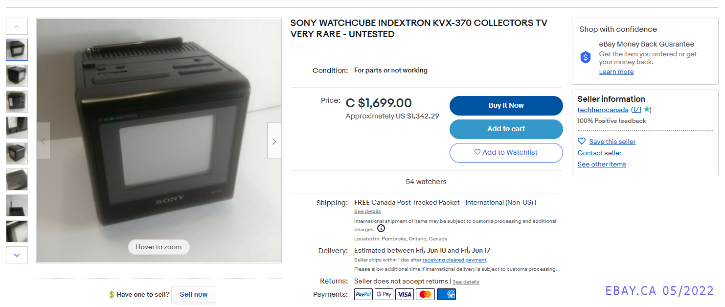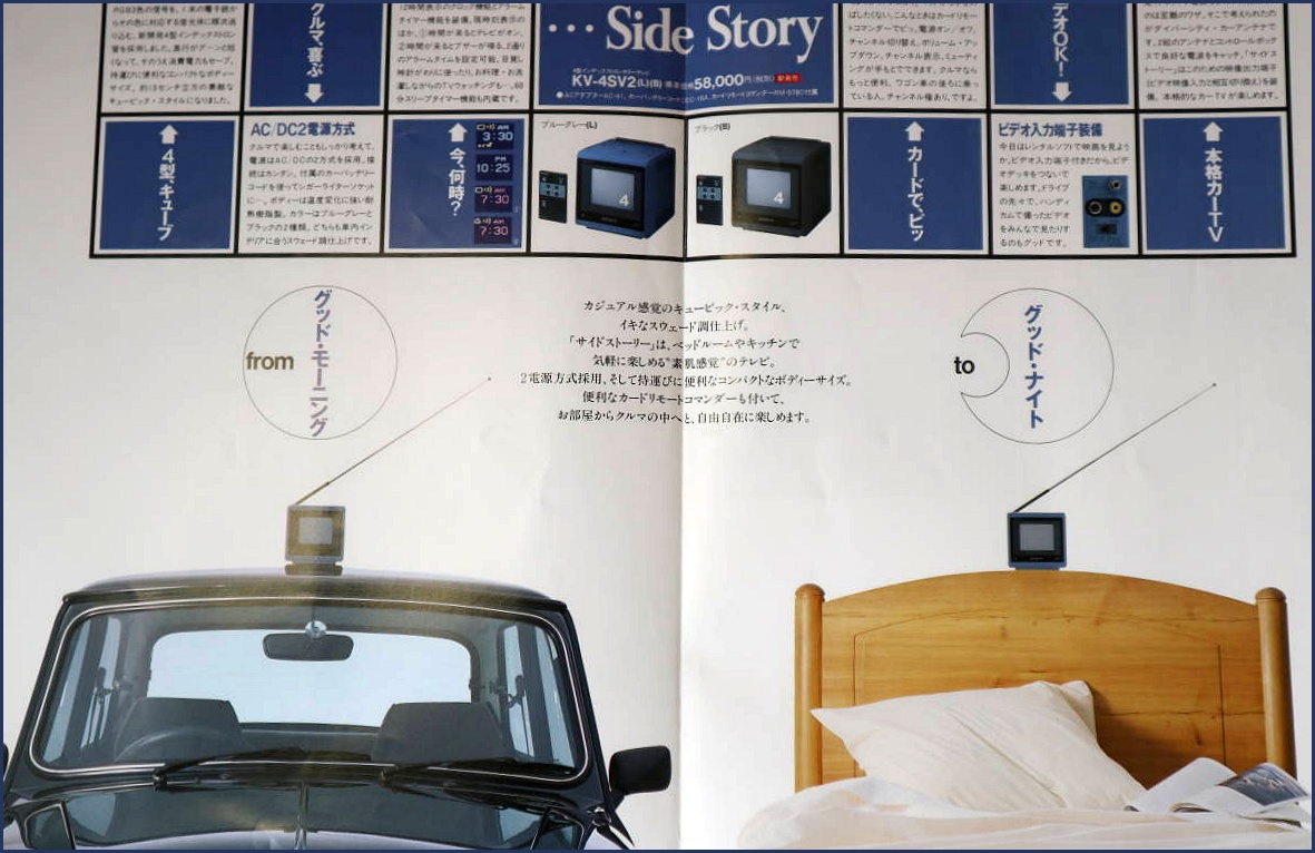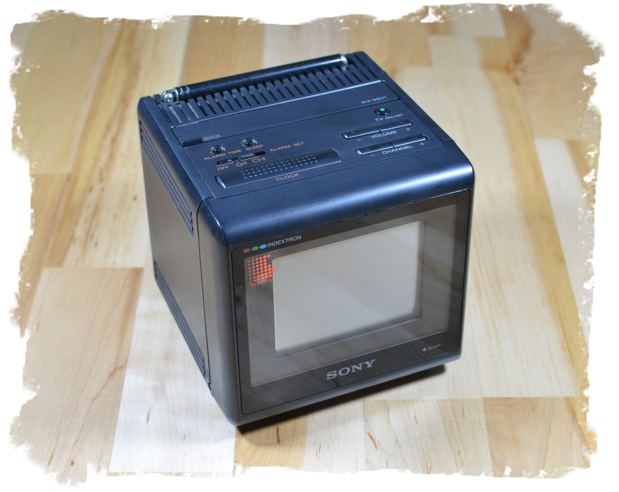 Zu manchen Fernsehern muss ich mir die Beschreibung zäh aus den Fingern leiern, bei anderen sprudelt der Text nur so. Wie zum Beispiel bei diesem einzigartigen SONY KV-4SV1 („Side Story“) alias SONY WatchCube KVX-370 aus dem Jahr 1988. Mit geringfügigen technischen Änderungen und einer scheckkartengroßen Fernbedienung gab es den Würfel darüber hinaus unter der Bezeichnung SONY KV-4SV2 ("from good mornning to good night"). Dieser kostete 1989 laut Datenblatt 58.000 Yen, das waren damals rund 830 DM. Der Neupreis der US-Variante KVX-370 lag bei 399 Dollar, im Versandhandel wurde er 1989 für 339 Dollar angeboten. Heutzutage werden für gebrauchte Exemplare auch gerne mal mehr als 1.000 US-Dollar aufgerufen.