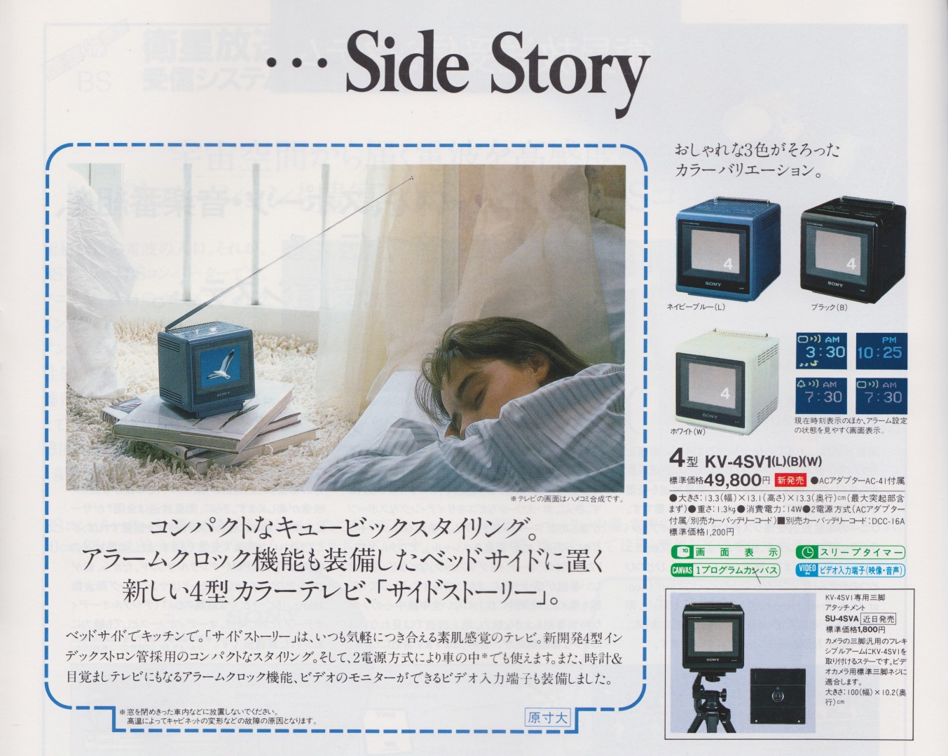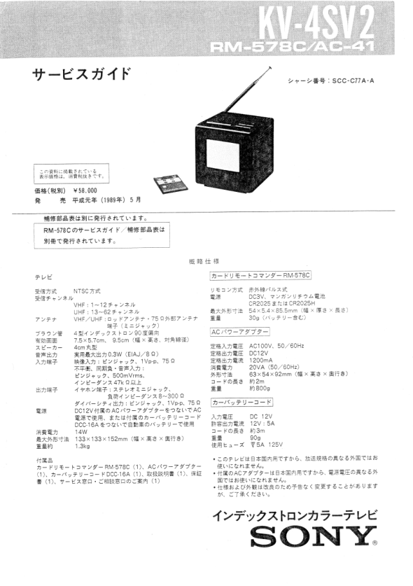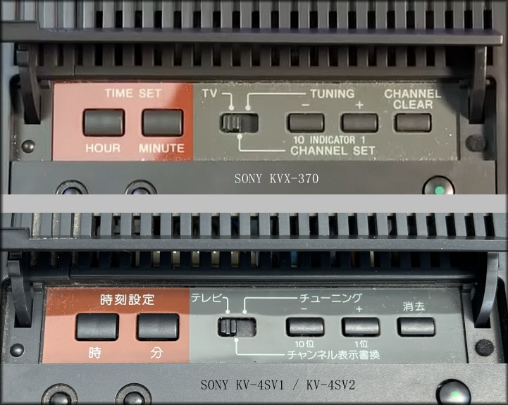 Der SONY KV-4SV1 war in den Farben Schwarz, Weiß und Blau erhältlich und verbraucht laut Typenschild bis zu 14 Watt (KVX-370: 15,6 Watt). Jedes der Modelle misst 133 * 133 * 152 mm und wiegt rund 1,3 kg. Made in Japan zwischen 1988 und 1989.