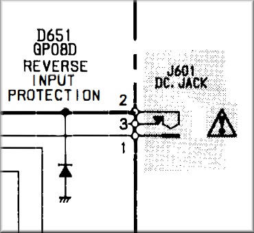 eine leicht schräge Positionierung. Ein Batteriefach gibt es nicht, die Stromversorgung erfolgt stets über eine externe Quelle. Achtung: Die Buchse erwartet 12 Volt mit Minus am Mittelstift. Die Schutzdiode D651 gegen Verpolung scheint nicht in allen Modellen bzw. Chargen vorhanden zu ein. |
