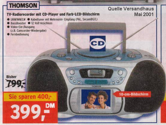 | Von Thomson gab's mit dem TMV1001 ein 4"-LCD-Gerät in der Kategorie Henkelmänner. Und als SABA längst in der französischen Thomson Gruppe aufgegangen war, erschienen zwei Versionen des SABA TV-Journey 2 (alias SEIKO LVD204) für SECAM L: Der SABA 8TCL888 und der Thomson TCL 11. | |