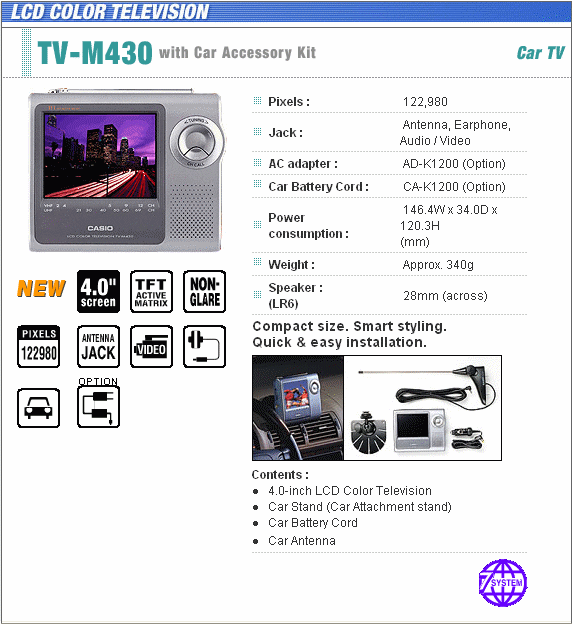 | Die von CASIO entwickelten 7-System Modelle EV-510S, TV-3500S, TV-8700L/S / TV-M420S und TV-M430 unterstützen (von SECAM L in Frankreich einmal abgesehen) alle europäischen Standards: PAL B/G, H, I, D/K und SECAM B/G, H, D/K, K'. Ideal darüber hinaus für Afrika, China und alle Ecken die ehemaligen Sowjetunion. | |