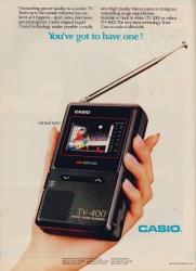 Action! Color! Excitement! , Where miracles never cease, You've got to have one! oder So kompakt kann Farbfernsehen sein! Die Werbung für den CASIO TV-400 aus dem Jahr 1987 jubelt. Der TV-400 ist tatsächlich ein echter Klassiker, denn er ist das erste Modell der erfolgreichen Baureihe TV-4x0. Die Geräte dieser Gattung unterscheiden sich (abgesehen vom übergroßen "Ausreißer" TV-450) nur in Details, der letzte Vertreter dürfte der TV-480 gewesen sein.