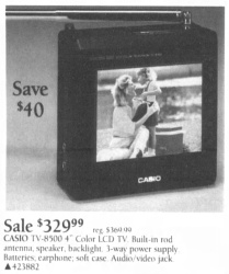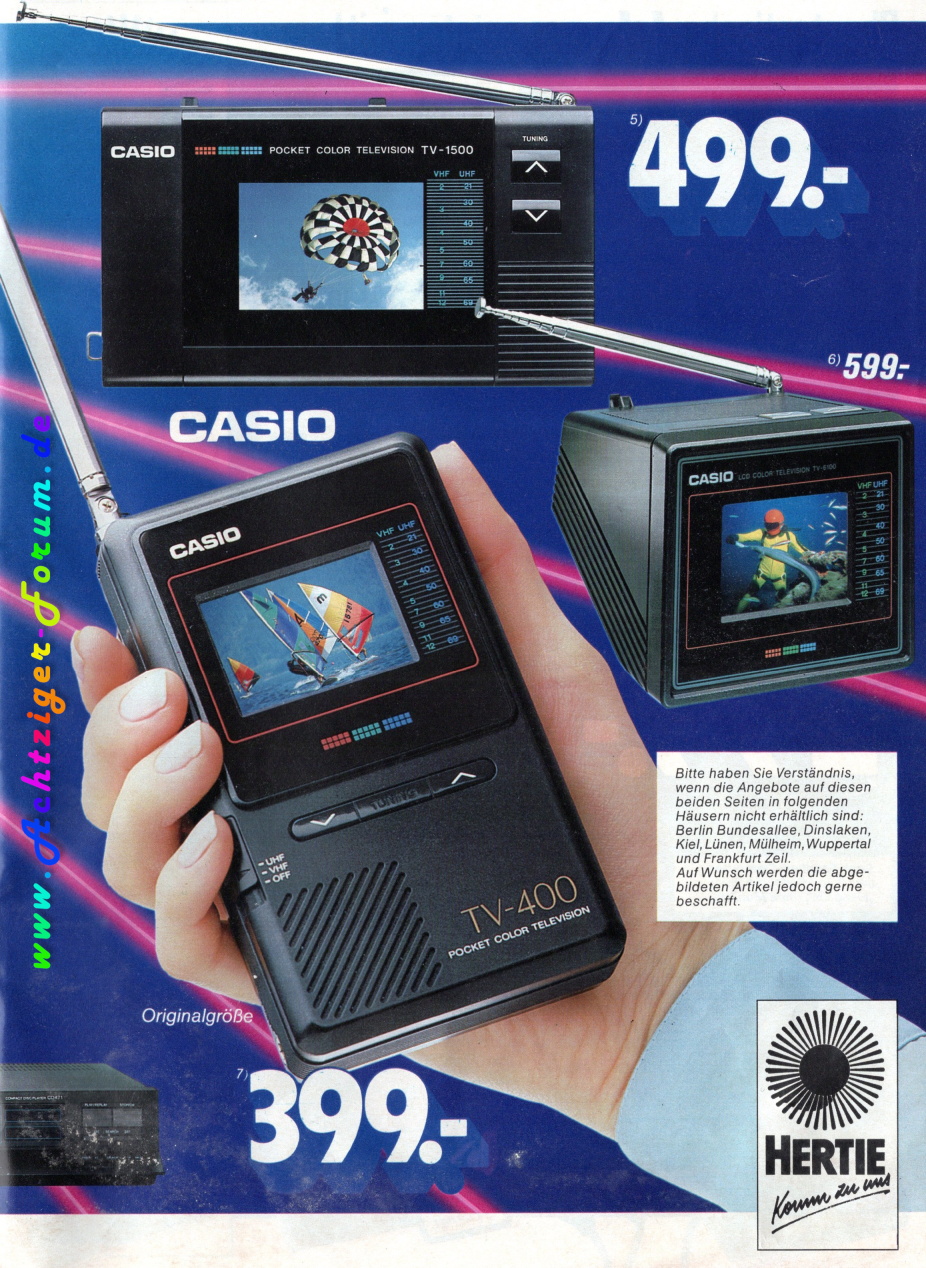 Leider bemühen sowohl die englischsprachige, als auch die deutschsprachige Werbung für den CASIO TV-1500 aus dem Jahr 1987 einmal mehr eines der (in diesem Zusammenhang) unsinnigsten Motive: Den Fußball. Ob irgendein Mensch aus der Marketingabteilung von CASIO jemals versucht hat, ein Fußballspiel auf einem passiven LC-Display zu verfolgen? Pro Spieler fünf träge Pixel - da hilft auch kein Aspirin mehr. Die sonstigen technischen Daten sind allerdings gehobener Standard in dieser Kategorie: 68 mm Bildschirmdiagonale, A/V-Eingang (3,5 mm) und Akku-Ladeeinrichtung.