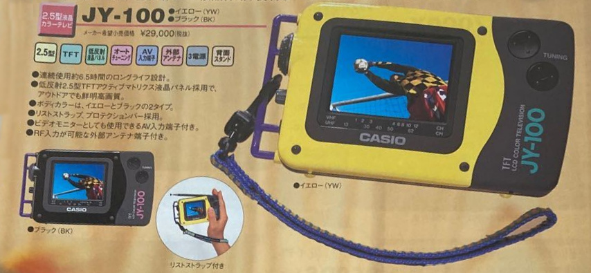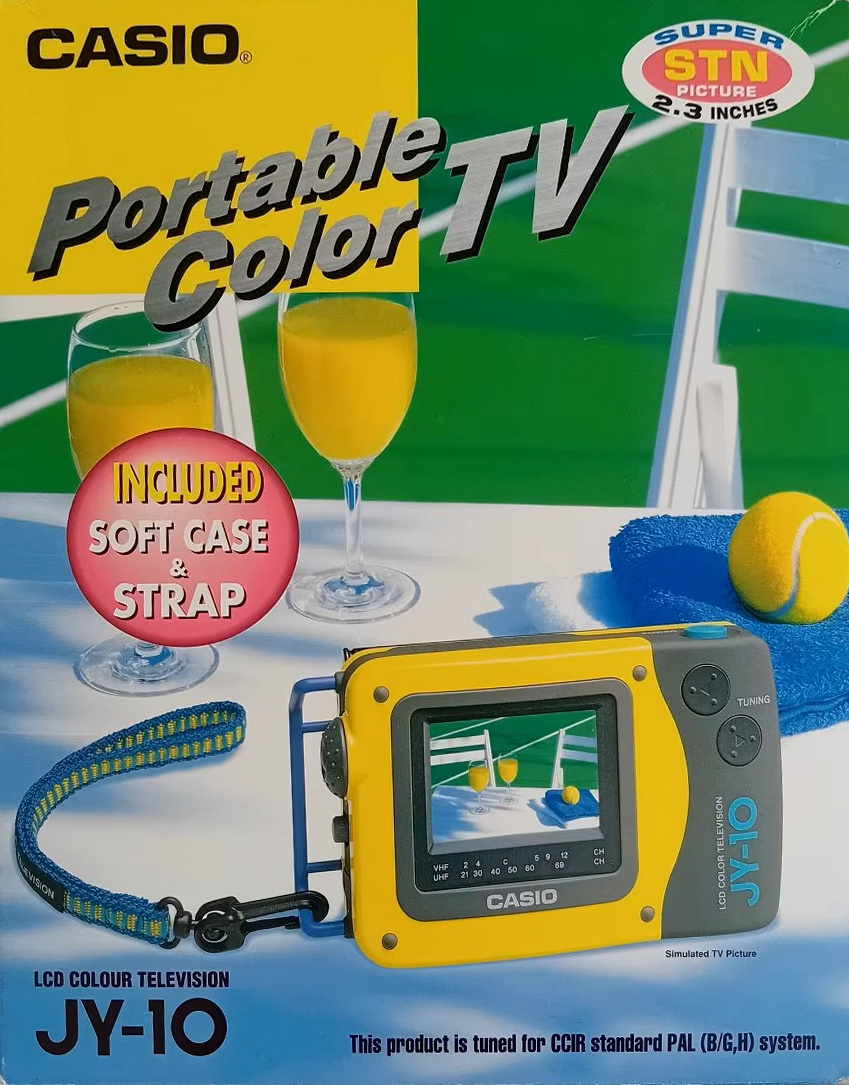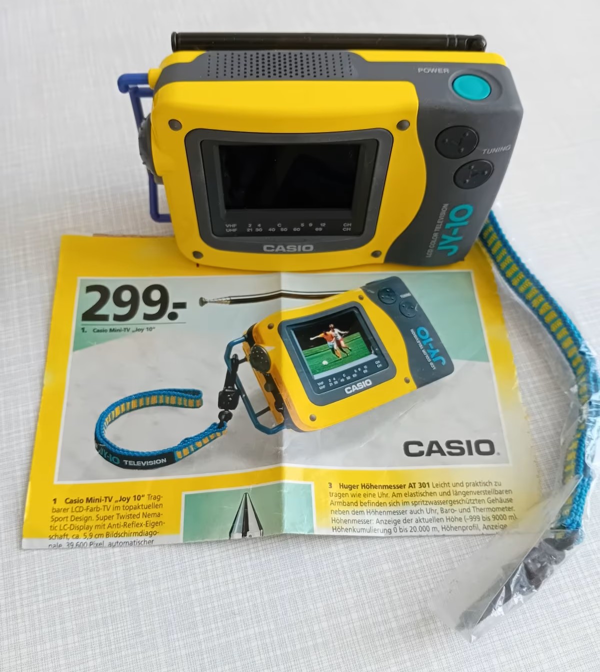 Das sei Die gelbe Freude, behauptet der Prospektmaler für den Outdoor-Fernseher CASIO JY-10 alias JOY-10 aus dem Jahr 1998. In einem schicken Gehäuse im Stil des SONY Sports Walkman steckt ein eher unspektakuläres Display mit einer Diagonale von 59 mm (360 * 110 = 39.600 Pixel). Alle Anschlüsse sind mit Gummistöpseln abgedichtet, obwohl der JY-10 nicht ausdrücklich als spritzwassergeschützt gekennzeichnet ist (im Gegensatz zu den Modellen der Baureihe "SY"). Erfreulicherweise besitzt der JY-10 einen A/V-Eingang, ein Antenneneingang ist zwar ebenso vorhanden, aber leider in Deutschland verschlossen. In den USA gab es das Ding 1999 auch als Radio Shack Optimus 16-179 für 149$ zu kaufen.