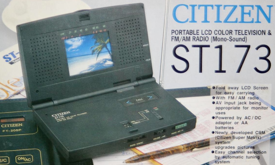 Man teile einen Taschenfernseher sinnvoll in zwei Hälften und heraus kommt... der CITIZEN M329 mit dem externen TV-Tuner CITIZEN TR30. Der Videomonitor M329 (alias TC56) eignet sich prima als Kontrollbildschirm für Videokameras, entsprechendes Befestigungszubehör und diverse A/V-Kabel befinden sich im Lieferumfang. Die Diagonale des passiven LCD liegt bei 2,9 Zoll gleich 76 mm, die Hintergrundbeleuchtung soll mindestens 1.500 bis 2.000 Stunden überleben. Weitere technische Details zum Display beschreibt das besonders ausführliche Datenblatt aus dem Jahr 1989.