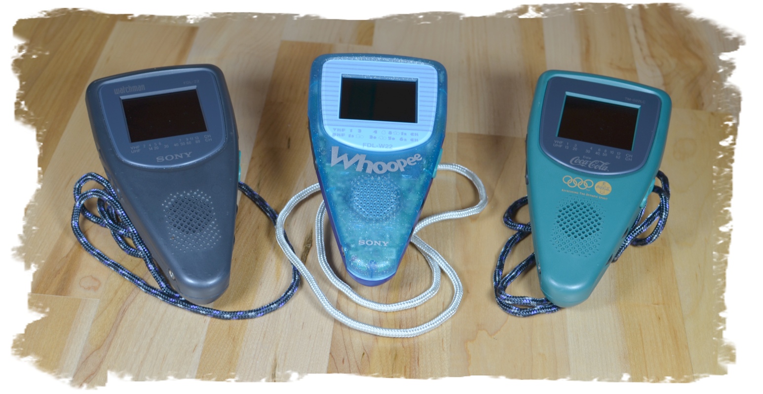 Im fröhlichen "Eistütendesign" präsentiert sich dieser SONY Watchman FDL-22 aus dem Jahr 1998 - abgesehen vom "aktiven" FDL-390BE der einzige LCD Minifernseher von SONY, der in Europa vertrieben wurde. In der Mitte sehen wir die nur in Japan erhältliche Version SONY Watchman FDL-W22 im halbtransparenten Gehäuse und rechts die Coca-Cola-Version TM-022LC, die es zur den Olympischen Spielen in Atlanta 1996 als Geschenk gab.