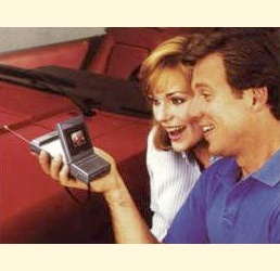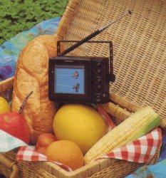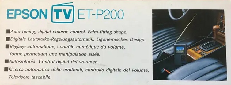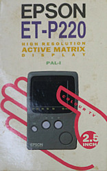 Ein weiteres Gerät aus den Werkstätten der japanischen SEIKO/EPSON Corporation ist dieser EPSON ET-P200 (alias Gelhard GXT 1000) aus dem Jahr 1989. Leider kann auch das nette Motiv auf der Verpackung nicht darüber hinwegtäuschen, dass der ET-P200 im Verhältnis zur Bildschirmgröße ein wenig zu wuchtig geraten ist. Die Qualität des aus 85.488 Elementen bestehenden TFT-Displays (2,6 Zoll gleich 65 mm) ist hingegen tadellos und so nette Details wie eine Akku-Ladeeinrichtung, ein Stativgewinde und einen A/V-Eingang (3,5 mm) haben die Ingenieure ebenfalls vorgesehen. Zumindest der Gelhard unterstützt laut Prospekt auch den italienischen Sonderkanal "C".