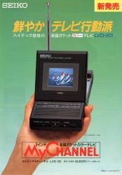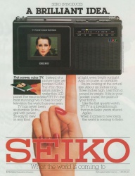 Anywhere you go, Seiko! Aus den Anfangsjahren "farbiger" Taschenfernseher stammt dieser SEIKO LVD202. Ein Display im Klappdeckel sollte den Betrieb bei Sonnenlicht ermöglichen ("the best color TV under the sun"), auf den Luxus eines Sendersuchlaufes musste man hingegen noch verzichten. Dafür hat man jetzt ein schönes Stück Technikgeschichte: Viele Knöpfe und Regler, ein vergleichsweise großes Gehäuse, randvoll mit diskret aufgebauter Elektronik (also nicht nur einige wenige Chips), sowie eine Displaytechnologie, die heute noch state-of-the-art ist.