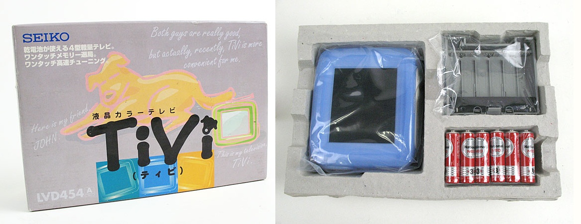 Ich liebe bunte Sachen! Auch wenn dieser SEIKO LVD454 aus dem Jahr 2002 nicht besonders edel daherkommt, so erfreut er doch durch seine frische Farbgebung. Das 4-Zoll (101 mm) TFT des SEIKO ist von gewohnt guter Qualität und als besonderes Extra besitzt der 454er eine automatsche Senderprogrammierung ("one-touch"), so steht es auch auf dem Karton. Auf diesem ist weiterhin zu lesen, dass ein Hund ("John") was Tolles sei, der kleine Fernseher ("TiVi") im Moment aber praktischer wäre. Ich glaube, so was gibt's nur in der japanischen Werbung.