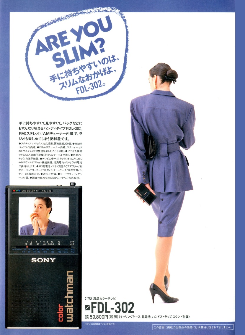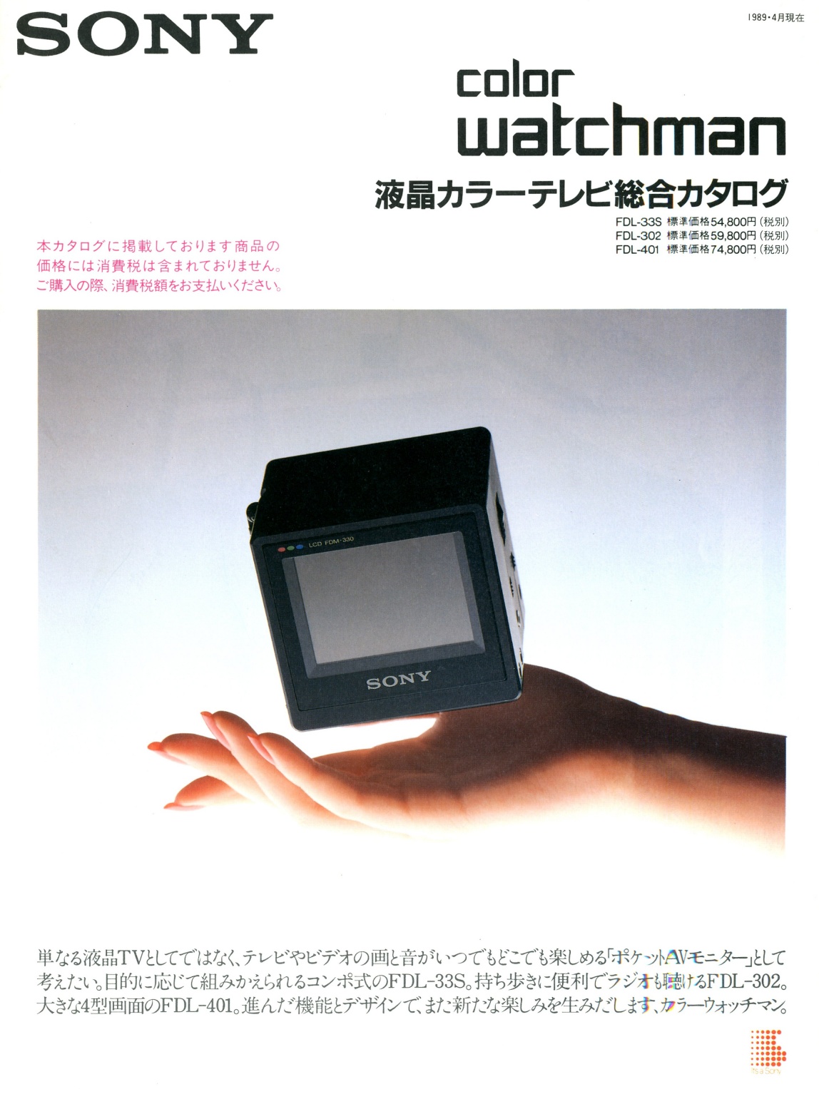 Nach meinen Erkenntnissen wurde der Component Color LCD Watchman TV von 1988 bis 1990 oder 1991 produziert, einer Broschüre aus dem Jahr 1989 zufolge soll er sogar der erste Farb-Watchman gewesen sein, wenngleich der FDL-320 (bzw. FDL-302) ebenfalls (?) im Jahr 1988 auf den Markt kam. Zum FDL-33S kenne ich darüber hinaus zwei weitere Prospekte, ein Deckblatt vom April 1989 und ein umfassendes Faltblatt.