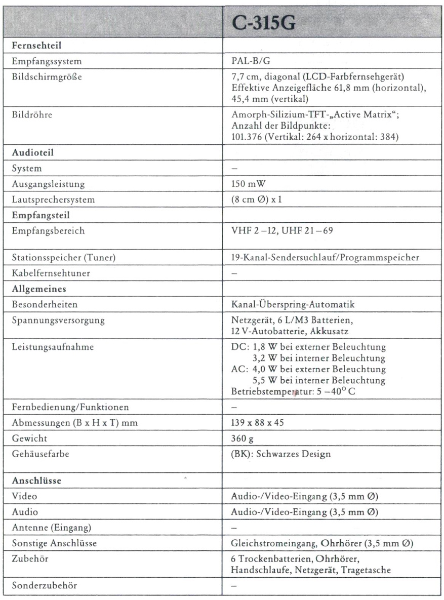 High-End vom Allerfeinsten aus dem Jahr 1991: Der Sharp C-315 bietet in edler Verpackung ein klappbares TFT-Display mit 76 mm Diagonale (101.376 Pixel), abschaltbare Hintergrundbeleuchtung, On-Screen-Display, Akku-Ladeeinrichtung, Wipptaste zur Helligkeitsregelung, Farbkontrastregler, separate Stativhalterung, Batteriewarnanzeige, A/V-Anschluss (2,5 mm Buchse) und - nicht selbstverständlich bei Taschenfernsehern dieser Zeit - sogar 20 Senderspeicher. Etwa 30 Sekunden vor dem Ableben der Hintergrundbeleuchtung wird laut Bedienungsanleitung ein entsprechender Warnhinweis im Display eingeblendet.