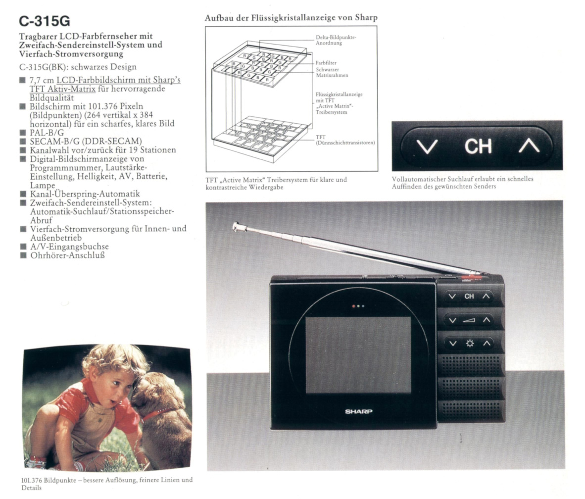 Im Jahr 1987 betrat Sharp die Bühne der TFT-Produzenten und startete mit dem Minifernseher Sharp 3C-E1 „Crystaltron“ und einem 3-Zoll-TFT mit 92.160 Pixel - das war damals Rekord. Im Internet findet man dazu sogar ein paar Informationen, beispielsweise, dass bereits 1986 ein Prototyp des Displays auf der Japan Electronics Show gezeigt wurde und man sich auf lebendige Farben freuen kann. Verschiedenen Quellen zufolge sei jedoch die Ausbeute bei der Displayproduktion recht bescheiden gewesen, sodass der 3C-E1 in Japan erst mit einem halben Jahr Verspätung auf den Markt kam.