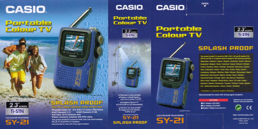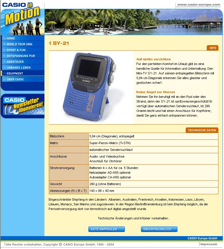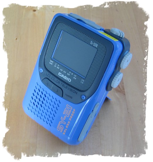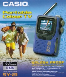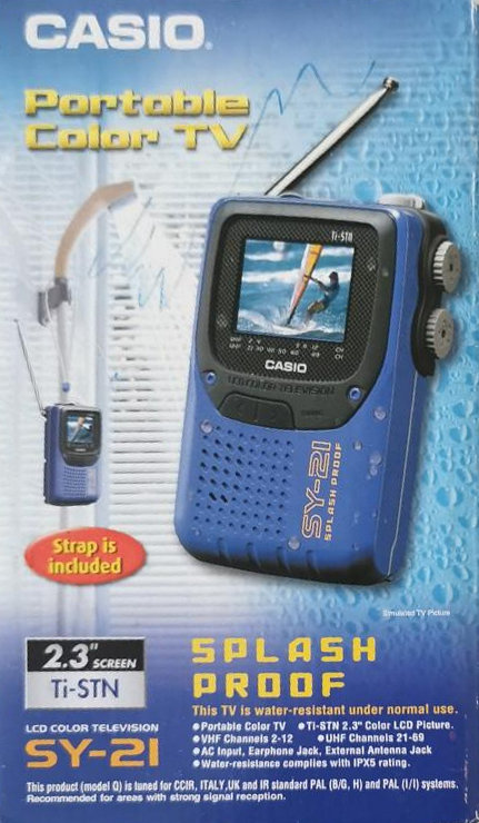 Fernsehen am Strand? Wasser und Sand können diesem schicken CASIO SY-21 aus dem Jahr 2002 relativ wenig anhaben. Bedauerlicherweise kommt das ansonsten recht ordentliche Display gegen helles Sonnenlicht nicht an, sodass man das Gerät besser zum night swimming mitnimmt. Grundsätzlich ist der SY-21 aber ein erfreulich pfiffiges Gerät, dass sich hinsichtlich Farbe und Design wohltuend vom üblichen Einerlei absetzt. Im Rahmen der Werbekampagne CASIO in Motion wurde das Gerät denn auch umfassend beworben: "Für den perfekten Komfort im Urlaub gibt es eine handliche Quelle für Information und Unterhaltung ...".