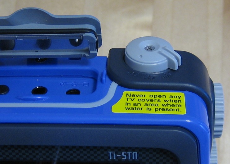 Besondere Mühe haben sich die Entwickler bei der Abdichtung des Gehäuses gemäß IPX5 ("Schutz gegen Strahlwasser aus allen Richtungen") gegeben. Eine Detailaufnahme zeigt eine metall-verstärkte Verschlussklappe und den grauen Dichtungsring des Gehäuses. Der abgebildete SY-21P unterstützt neben dem "hiesigen" TV-Standard PAL B/G, H auch PAL I (England/Hongkong/Südafrika).