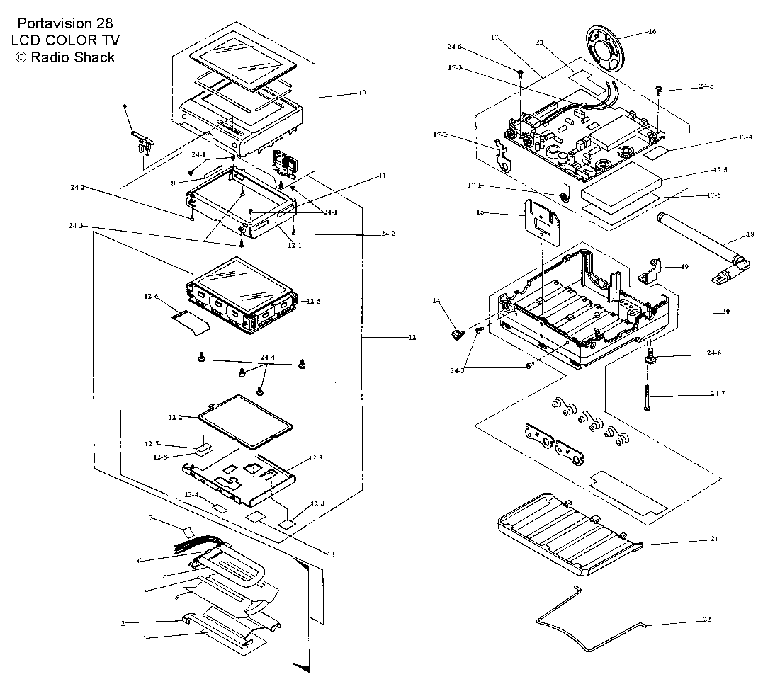 Den relativ trickreichen Aufbau des TV-350 aus dem Jahr 1994 zeigt die Explosionszeichnung. Die technischen Daten erinnern an den TV-100 aus gleichem Hause: 1,6 Zoll Display (40 mm), Auflösung 39.600 (110 * 360) Bildpunkte, kein Videoeingang, kein Schnickschnack. Immerhin ist ein 3,5 mm Klinken-Anschluss für eine externe Antenne vorhanden.
