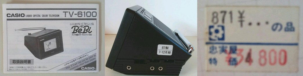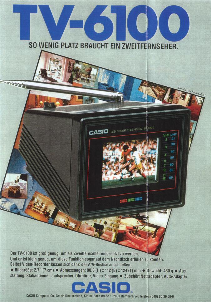 Die Werbung spricht vom New Age of Television und führt in hübschen Bildern vor, wo uns zukünftig ein Fernseher (vorzugsweise der TV-6100) begleiten wird: Im Auto, beim Sport, tagsüber beim gepflegten Gläschen Orangensaft und natürlich am und im Bett. Die nackten Fakten: 68 mm Bildschirmdiagonale (2,7"), A/V-Eingang (3,5 mm) und - wie üblich - kein Antenneneingang in Deutschland. In Japan wurde der 6100er 1987 zu Preisen zwischen 34.800 und 39.800 Yen verkauft, das entsprach zu jener Zeit etwa 420 bzw. 480 DM. In Deutschland kostete er 599 DM.