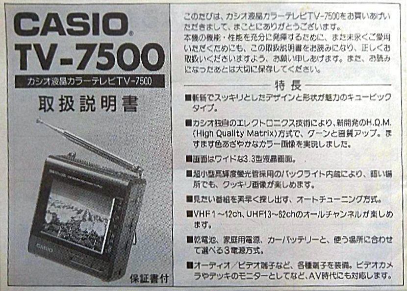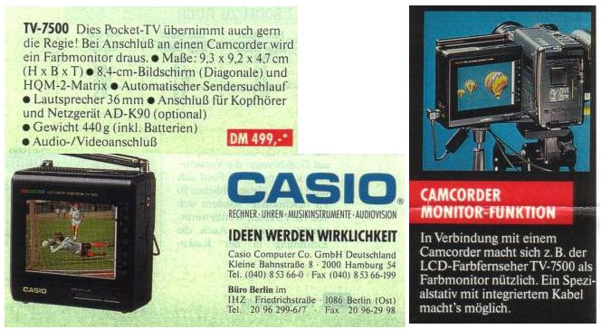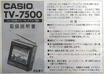 Quadratisch, praktisch... Der CASIO TV-7500 gehört zu den größeren "Passiven" aus der reichhaltigen CASIO Produktpalette. Die Bildschirmdiagonale beträgt stolze 3,3" gleich 83 mm, das passive HQM-2-Display besteht aus 118.580 Elementen. Der Listenpreis lag im Jahr 1990 bei 499.- DM, in Großbritannien wurde er im Jahr 1991 immer noch für knapp 200 Pfund angeboten, das waren seinerzeit knapp 580 DM.