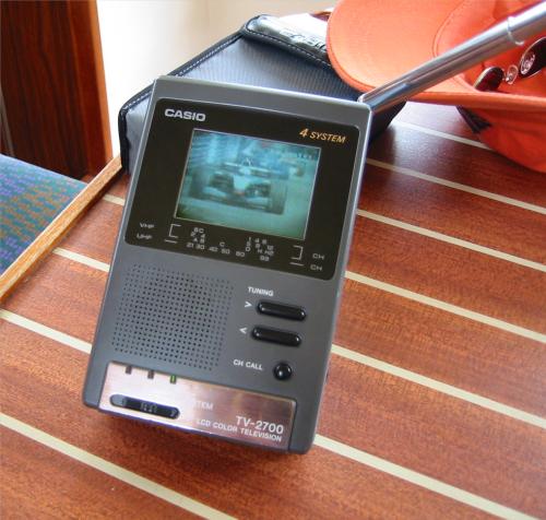 Neben der "Multi-Norm-Fähigkeit" hat der TV-2700 aber noch andere Qualitäten: Ein vergleichsweise ordentliches 64 mm Display (zumindest hat's für eine Formel-1-Übertragung während eines Hausboot-Trips in Frankreich gereicht), einen A/V- und Antenneneingang, einen Farbkontrastregler, sowie drei verschiedenfarbige Kontroll-Leuchtdioden für die gewählte Fernsehnorm (siehe Kurzbeschreibung). Laut Typenschild wurde die spezielle Kanalbelegung in Italien ebenfalls berücksichtigt. Der TV-2700 ist (nicht nur hierzulande) außerordentlich selten, verbraucht beeindruckende 4,6 Watt und wiegt inklusive 6 Mignon-Akkus gut 460 Gramm. Made in Japan.