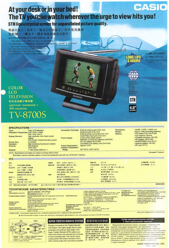 Das Leben kann so hart sein: Camping in Frankreich ist ein Traum, aber den passenden Taschenfernseher (für die verregneten Abende) zu finden, ist ein echtes Drama. Eines der ganz wenigen Geräte, das bei unseren französischen Nachbarn zu analogen Zeiten funktionierte, ist der CASIO TV-2700. Er kommt mit allen drei Fernsehstandards in Westeuropa zurecht ("Innovative Multi System").
